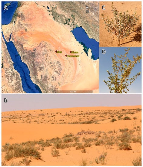 (A) a map of Saudi Arabia showing the three regions of the sampled A. monosperma populations, (B) an overview of the A. monosperma population in a sand dune habitat, (C) an overview of the A. monosperma shrub, and (D) a close view A. monosperma flowering branches.