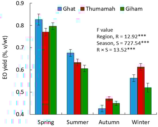 Yielded EOs of A. monosperma during the four seasons from the three regions. *** p < 0.001.