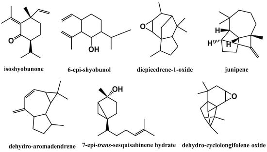 From all the assigned compounds, 7-epi-trans-sesquisabinene hydrate, dehydro-aromadendrene, junipene, 6-epi-shyobunol, and α-bulnesene were identified as the main EOs components (Figure 3). Although the dehydro-aromadendrene was represented in a high concentration in the EOs of the plant collected in spring, summer, and autumn, it was identified in trace amounts in the winter sample. Ledene oxide-(II) was determined as a major compound in EOs extracted from spring and winter samples (4.28% and 8.95%, respectively), though it was assessed as a minor compound in the EOs of the samples collected in the summer and autumn samples. In addition, aromandendrene was assigned with considerable concentrations in the EOs of spring (3.19%), summer (3.94%), and autumn (4.85%) samples but low in the winter sample. The dehydro-cyclolongifolene oxide was identified with a high concentration in the EO of the summer sample only, with a concentration of 6.57%. The diterpenes were totally absent in the EOs collected during the summer from the Ghat region. Furthermore, the monoterpene hydrocarbons were totally missed in the EOs of the plant samples collected during the spring and winter seasons.