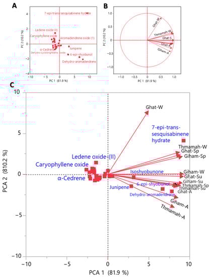 The principal components analysis (PCA) of various compounds identified from the samples collected from the three studied regions (Ghat, Thumamah, Giham) during the four seasons. (A) the observation in the PCA space, (B) the correlation circle (variables chart), and (C) the biplot diagram.