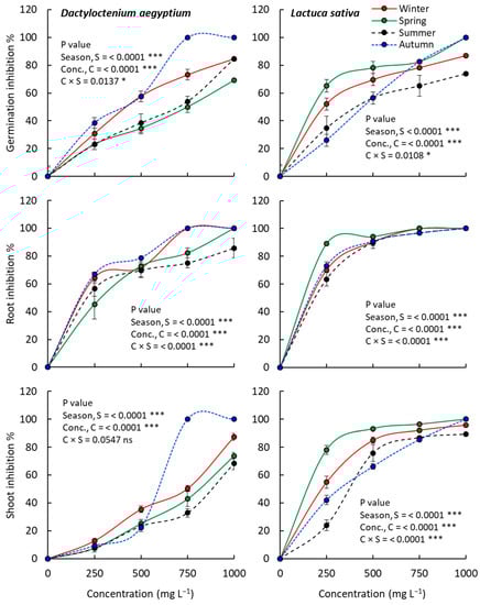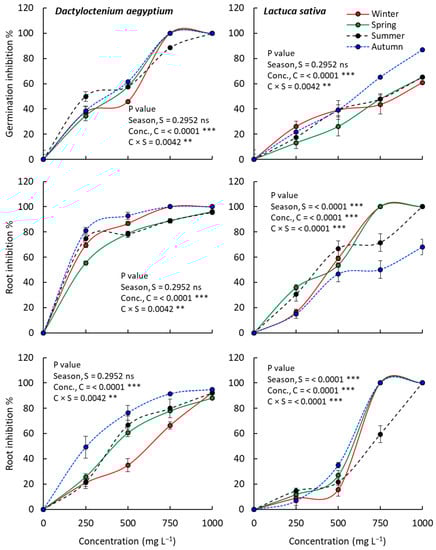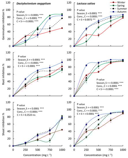 Seedling shoot growth of D. aegyptium exposed to the EO of A. monosperma at a concentration of 1000 mg L−1, declined by 82.3, 78.5, 74.7, and 44.5% for the samples collected during spring, autumn, summer, and winter, respectively. While the seedling shoot growth of L. sativa was more inhibited under the same concentration of the EO, where it declined by 95.8, 92.2, 92.2, and 89.1% for autumn, spring, summer, and winter, respectively (Figure 5).