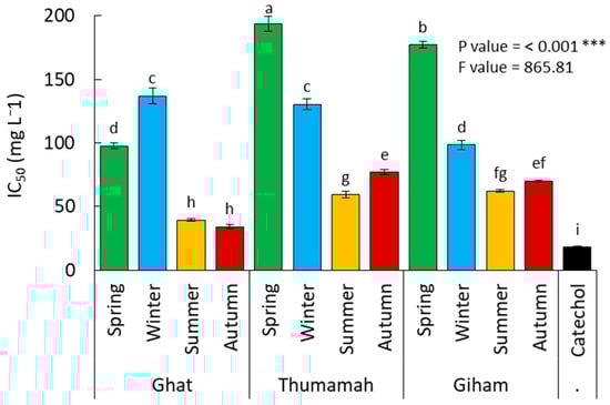 The IC50 of the essential oils extracted from A. monosperma collected from three regions (Ghat, Thumamah, and Giham) during the four seasons (spring, winter, summer, and autumn) as well as catechol as standard antioxidant. *** p ˂ 0.001. The different letters among columns showed significant differences at p ˂ 0.05.