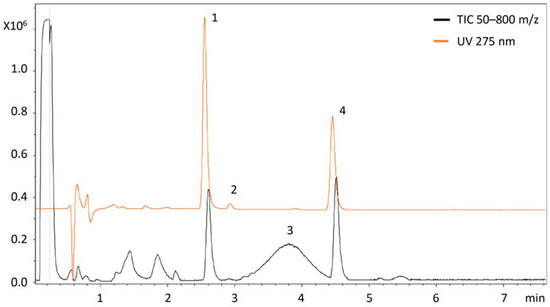 LC-MS was used to analyze reference standard signals from unhydrolyzed and hydrolyzed samples. Figure 1 shows the total ion chromatogram with the superimposed UV chromatogram. The UV-active substances 1 and 4 could be assigned to hydroxytyrosol and tyrosol. Signals 2 and 3 are only present after acid hydrolysis of extra virgin olive oil. Hydrolyzed samples showed additional peaks in the total ion chromatogram between the two main compounds but were mostly inactive under UV. These signals were identified as 283.076 m/z, but no match was found in MetFrag databases (KEGG, HMDB). Further details and MS-spectra are provided as supplementary material (Figures S1–S4).