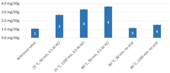 Olive oil samples without hydrolytic agent, which were incubated with water instead, served as a reference for the first assessment of thermal stability. Figure 2 compares the total yield of hydroxytyrosol and tyrosol of the reference samples (bar one) with the yield of five different conditions (bars two to six). Apparently, treatment at 80 °C (bar five) releases only a negligible amount of hydroxytyrosol and tyrosol, and even after 20 h (bar six), the yield remains low compared to even moderately acidic conditions (i.e., 25 °C and 0.5 M hydrochloric acid, bar two). This is also underlined by the chromatogram in Figure 3, which shows the increase in signal upon treatment with acid at constant temperature. It can be appreciated that under such acidic conditions, prolonged incubation at room temperature (bar three) cannot compensate for the benefit of elevated temperature (bar four).
