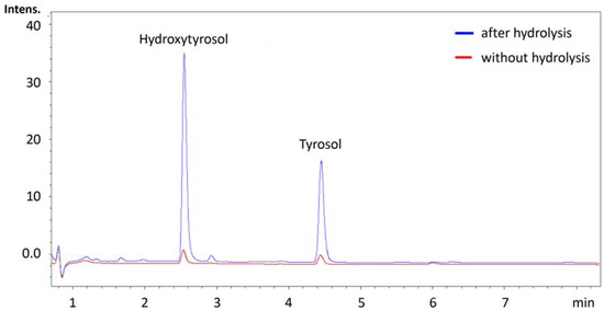 Comparison of a sample treated at 80 °C without acid (red) and a sample treated with 0.5 M hydrochloric acid (blue); the peaks at around 2.5 and 4.5 min represent hydroxytyrosol and tyrosol, respectively.