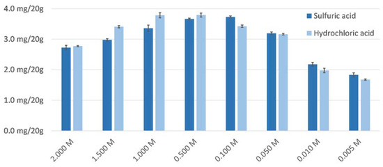 Considering that hydrochloric acid and sulfuric acid are commonly employed for acidic hydrolysis, a comparison of both acids’ hydrolytic capabilities at varying molarities seems warranted. Unsurprisingly, both acids yielded similar values, as can be noted from Figure 4. Hydrochloric acid is responsible for slightly higher amounts of hydroxytyrosol and tyrosol at concentrations of 0.5 or 1.0 M. For the further experiments, and also from an economic perspective, 0.5 M acid concentration was chosen.
