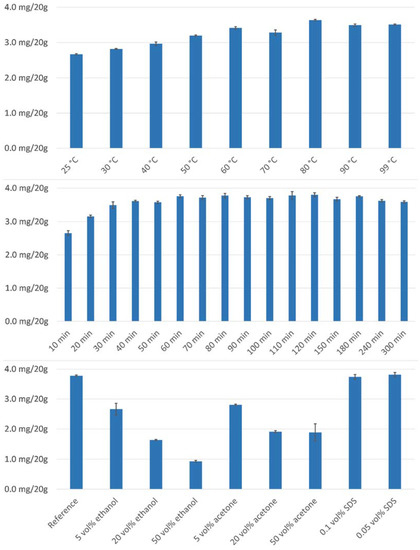 Figure 6(top) reveals that higher temperatures, such as 80 °C, are responsible for increased conversion. While the yield at higher temperatures is arguably quite similar, the observation from Figure 2 justifies that such elevated temperature largely eliminates the need for exhaustive incubation times and makes the use of a laboratory shaker with a heating element reasonable. In this regard, the reader’s attention is drawn to Figure 6(middle), which shows the yield at 80 °C for different incubation times. Although the yield does not increase significantly when the incubation time is extended beyond 30 min, longer reaction times can be justified since the remaining time can be efficiently used to prepare a second set of samples. Typically, 24 samples can be incubated in parallel using a commercially available laboratory shaker. What remains to be investigated is the choice of solvent used to dilute the hydrolyzing agent. The use of a more lipophilic co-solvent seems justified by the composition of the oil matrix, which probably improves the miscibility of the two phases. However, care must be taken to ensure subsequent phase separation. Ethanol and acetone concentrations of up to 50% by volume proved to be unproblematic. For SDS, concentrations above 0.1 vol% were responsible for excessive foaming, which negatively affected the reproducibility of the experiment. The data from Figure 6(below) clearly show that both ethanol and acetone are responsible for deteriorated yields. Probably due to the low concentration, SDS has no effect on hydrolysis and gives results similar to acid diluted with water. More information on optimizing the hydrolysis time is provided as supplemental material (Table S3).