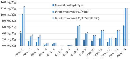 Based on these observations, the use of 0.5 M hydrochloric acid at a temperature of 60–80 °C in conjunction with an incubation time of 60–90 min is recommended. Since no weakening of the signal was observed when known amounts of hydroxytyrosol and tyrosol were incubated in water under the above conditions, the stability of the analytes is assured. However, the yield comparison of fourteen extra virgin olive oils was conducted with and without a small amount of SDS (Figure 7). For most oils, a slight and sometimes even significant increase in yield could be observed when using SDS. This can be attributed to phenols bound to highly lipophilic moieties such as fatty acids. These are likely to be stabilized by SDS in the more hydrophilic hydrolysis environment present. On average, the yield attributed to 0.05% by volume SDS is 11% by weight. Comparing the yield with that of the conventional approach mentioned before, it is clear that the hydrolysis of the polar fraction is not only more labor intensive, but is also responsible for a lackluster yield of tyrosol and hydroxytyrosol. On average, the traditional approach captured only 47 wt% of the two phenols present in the oils tested.