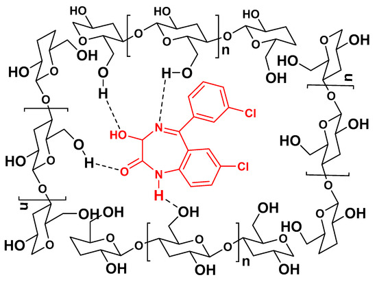 Cellulose, the basic building block of pristine cellulose filter paper, is a hydrophilic linear polymer of β-D-glucopyranose [25]. Each dimer possesses three hydroxyl functional groups. β-1,4-glycosidic bonds connect the dimers. In addition to the hydroxyl functional groups, β-D-glucopyranose contains an oxygen atom in its cyclic structure. All these hydroxyl and oxide functional groups can form hydrogen bonds (both as hydrogen bond donors and acceptors). As a result, pristine cellulose filter papers may interact with compounds possessing hydrogen bond donors and/or hydrogen bond acceptors in their molecular structures. The hydrophilic surface property of cellulose filter paper exerts a high affinity towards water molecules. Consequently, hydrated analytes (preferentially polar and medium polar compounds) come in close contact with the cellulose surface and interact with the analytes via hydrogen bonding. LZ is a moderately polar analyte (log KOW 2.39) possessing two hydrogen bond acceptors. Due to its medium polarity and hydrogen bonding capability, it demonstrates a high affinity towards LZ molecules. The potential interactions between cellulose paper and LZ are shown in Figure 1.