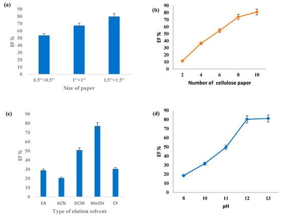 The role of back-extraction solvent is to desorb the adsorbed analytes on CP. Therefore, polarity of the back-extraction plays a key role in this process. All back-extraction solvents may not be equally efficient for desorption of adsorbed analytes on cellulose paper due to polarity differences. Five commonly used back extraction solvents, including chloroform (CF, relative polarity 0.259), methyl alcohol (MeOH, relative polarity 0.762), acetonitrile (ACN, relative polarity 0.46), dichloromethane (DCM, relative polarity 3.1), and ethyl acetate (EA, relative polarity 0.228), were evaluated in a series of experiments to determine the best back-extraction solvent for LZ from CP. It is evident from Figure 2c that the highest EF for LZ was obtained when MeOH was used as back-extraction solvent. Therefore, MeOH was chosen as the back-extraction solvent in all subsequent analyses.