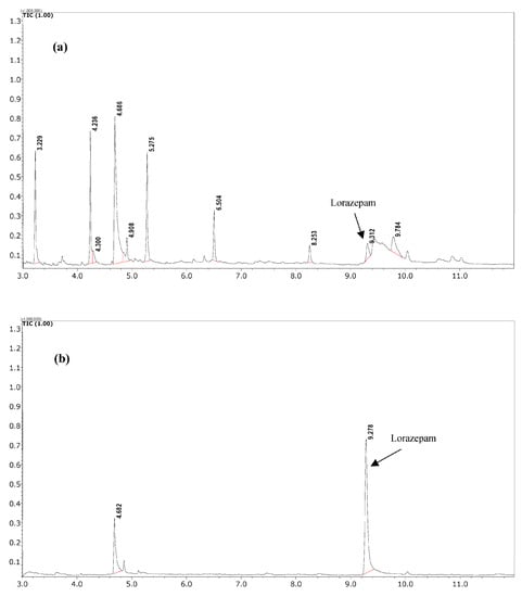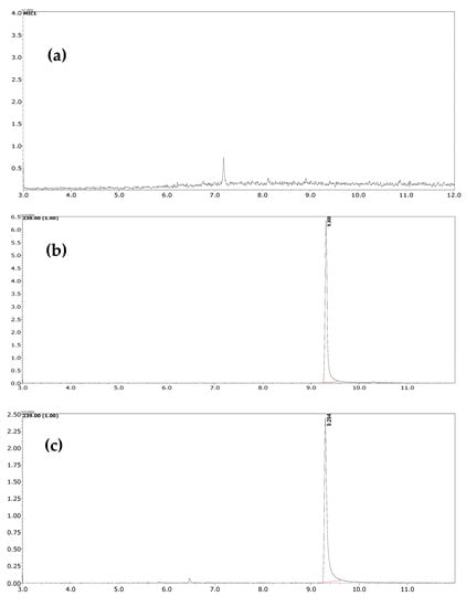 The selected ion chromatograms (SIM) of (a) blank, (b) standard (10 µg·mL−1), and (c) real forensic samples (tea sample from case 1). Peak identification: Lorazepam at 9.29 min.