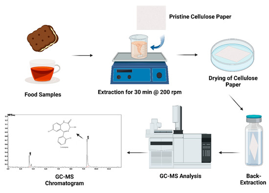 The procedure is fairly straightforward and consists of just two steps: (i) adsorption of the target analyte on CP and (ii) desorption/back-extraction of the adsorbed analyte on CP in MeOH. Initially, one mL of tea sample or one gram of cream biscuit sample were fortified with LZ a concentration of 1 µg·mL−1 or 1 µg·g−1, respectively. The tea sample without any pretreatment was diluted up to 10 mL with ultrapure water maintained at pH 12 with the help of 0.1 M NaOH. Six pieces of equally cut CP (size 1.5″ × 1.5″) were dipped in the sample and gently rotated on a rotary shaker at 200 rpm for 30 min. This facilitated the adsorption of LZ in the sample on CPs. The pieces of CPs were then taken out and dried at room temperature. Furthermore, they were dipped in 2 mL of MeOH for back extraction of LZ and allowed to stand for 15 min without any agitation. Following back extraction, the CPs were discarded and the extract was evaporated to dryness under a gentle stream of nitrogen, reconstituted with 200 µL of MeOH and subjected for GC–MS analysis. For solid samples (i.e., cream biscuits), one gram of sample was thoroughly mixed with 10 mL of ultrapure water maintained at pH 12 and centrifuged at 5000 rpm for 3 min. As previously stated, the obtained supernatant was subjected to CPSE–GC–MS analysis. A graphical representation of the proposed protocol is shown in Figure 6.