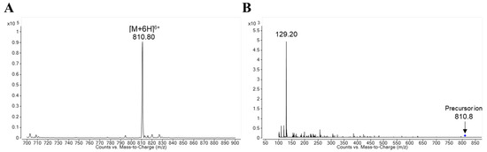 Ion spectra of (A) protonated lixisenatide and (B) product ion of protonated lixisenatide ([M + 6H]6+, m/z = 810.8).