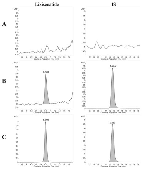 Chromatograms of lixisenatide and the internal standard (IS) in (A) blank rat plasma, (B) blank rat plasma spiked with lixisenatide at the LLOQ concentration (10 ng/mL) and IS, and (C) blank rat plasma spiked at the ULOQ concentration (2000 ng/mL) and IS.