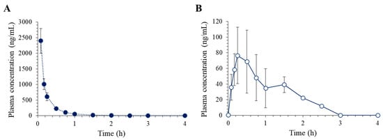 Average plasma concentration vs. time profiles of lixisenatide following (A) intravenous injection at 1 mg/kg (n = 5) and (B) subcutaneous injection at 5 mg/kg (n = 5) in rats.