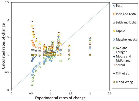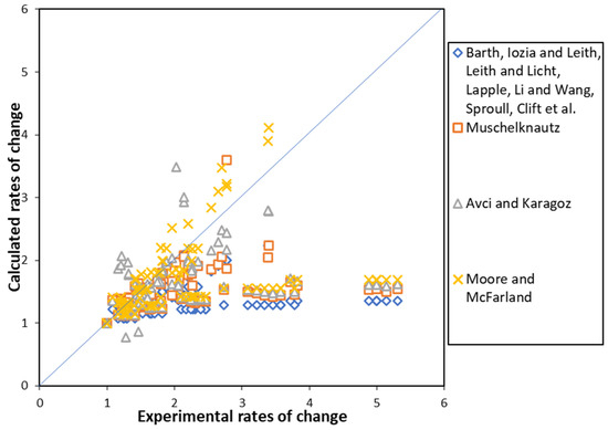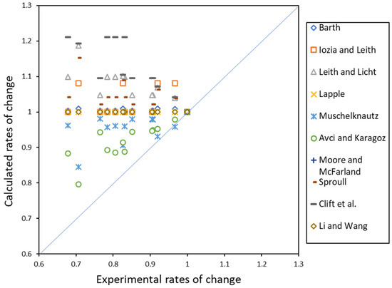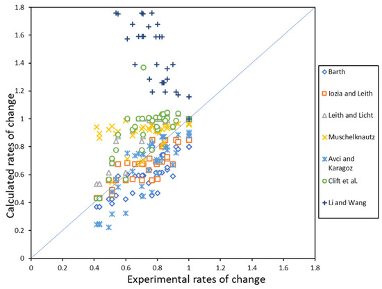 To assess the effect of temperature, the results of the experimental studies by Bohnet [18], Parker et al. [20], and Patterson and Munz [19] were used. The experimental critical diameter values increased with increasing temperature in the data used, and all models predicted this increasing trend. However, there were differences in the rates of change. Although the critical diameter values calculated at different temperature values in the models of Barth, Iozia and Leith, Lapple, Sproull, and Clift et al. differed, it was observed that the rates of change were the same for all of them, as the change in temperature affects the critical diameter value in direct proportion to the square root of the viscosity of the gas; in other words, these models reacted to temperature change in the same way. The comparison of the experimental critical diameter change rate with temperature and the calculated critical diameter rates is shown in Figure 10. According to the data in Table 8 regarding the proportional prediction ability, the models of Muschelknautz, Leith and Licht, and Moore and McFarland performed the best, in terms of predicting the effect of temperature changes.