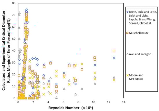 Calculated and experimental critical diameter ratios margin of error percentage under variation in Reynolds number [48].