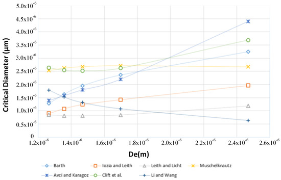 Although the models generally showed similar trends, as can be seen from the figure above, some models showed different trends in some studies, when considered on the basis of experimental work. In this sense, the model calculations using the data of Hsiao et al. [16] were examined; the change in critical diameter with the change in De is shown in Figure 5. Looking at the figure, it can be seen that there was a decreasing trend in the critical diameter with an increase in De for the first three De values in the models of Leith and Licht and Clift et al., followed by an increasing trend after this point. In addition, for the model of Muschelknautz, the critical diameter can be seen to decrease after increasing up to the fourth De value.