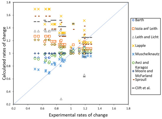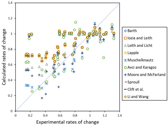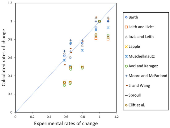 Next, we discuss the proportional response of the models to variation in the cyclone diameter. The experimental data of Moore and McFarland [14], Dirgo and Leith [7], and Zhu and Lee [12] were used for this evaluation, which indicated that the critical diameter value increases with increasing cyclone diameter (Figure 12). This change was found to be the same in all model calculations. Although the increase in cyclone diameter was predicted to increase the critical diameter by all models, the rates of change differed. In this sense, conclusions can be drawn by looking at Table 10, which provides the mean absolute error and mean absolute squared error values for the rates of change. According to the mean absolute error values, the first three models that made the best predictions were those of Leith and Licht, Clift et al., and Iozia and Leith, respectively.