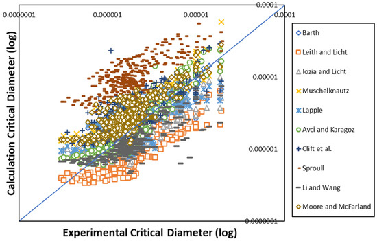 Proximity of calculated critical diameter value and experimental critical diameter values (logarithmic).