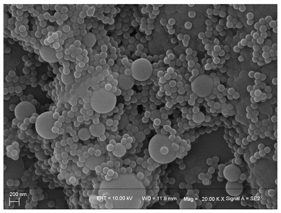 Figure 1 presents the SEM results of PS nanoparticles, which demonstrated a regular spherical structure. Although a limited number of particles had diameters exceeding 100 nm, they likely formed due to the aggregation of multiple nanoparticles during synthesis. Most of the particles had diameters around 100 nm, displaying a narrow size distribution.