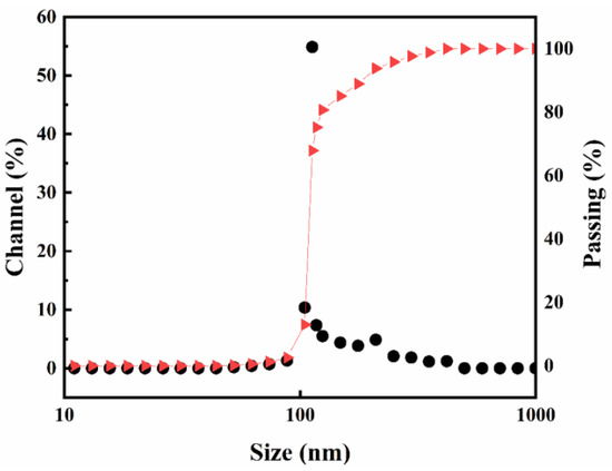 Figure 2 depicts the results of laser particle size analysis of PS nanoparticles. The percentage of particles smaller than 100 nm was negligible, with most nanoparticles having diameters around 100 nm, and a small number of particles exceeded 100 nm in diameter. Remarkably, the results of both SEM and laser particle sizing tests were highly consistent.