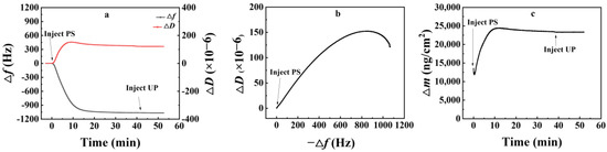 The curves of −Δf versus ΔD depicted in Figure 5b displayed a gradual decrease in slope, indicating densification of the nanoparticle adsorption layer with increasing adsorption. The change in adsorption amount (Figure 5c) revealed that PS nanoparticle adsorption capacity initially increased rapidly upon addition, then gradually slowed down, followed by a minor decline after water washing.