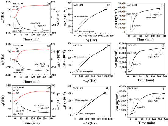 The −Δf versus ΔD curves shown in Figure 6b,e,h are divided into two distinct segments. The first segment is attributed to NaCl adsorption, displaying a linear curve and suggesting an unchanged adsorption layer configuration. The second segment is caused by PS nanoparticle adsorption, with Figure 6b,e showing a section of decreasing slope. This outcome implies densification of the adsorption layer with increased adsorption capacity, potentially due to nanoparticle self-adhesion. Figure 6h displays a straight-line segment, indicating greater nanoparticle stability under a higher ion concentration environment and an unchanging adsorption layer configuration.