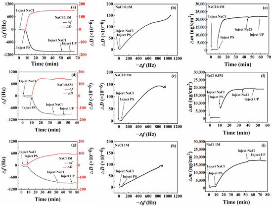 At NaCl concentrations of 0.5 M and 1.0 M (Figure 6d and Figure 6g, respectively), Δf and ΔD exhibited slower changes after PS emulsion addition. Cleaning with NaCl solution resulted in increased Δf and ΔD magnitudes, attributed to NaCl adsorption. Subsequently, water washing returned Δf and ΔD to their original magnitudes, indicating desorption of newly adsorbed NaCl from the surface.