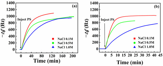Figure 7 compares −Δf variations induced by PS nanoparticle adsorption under different Na+ ion concentrations. The impact of different Na+ ion concentrations on PS nanoparticle adsorption behavior onto amorphous carbon (Figure 7a) and SiO2 (Figure 7b) surfaces was similar. With increasing Na+ ion concentration, the curves with time displayed smaller slopes, indicating slower PS nanoparticle adsorption rates onto both amorphous carbon and SiO2 surfaces after Na+ ion adsorption.