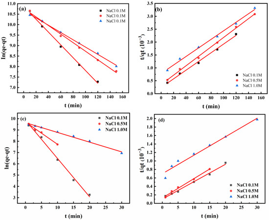 Results of fitting the adsorption kinetics of PS nanoparticles onto the surfaces of amorphous carbon (a,b) and SiO2 (c,d) at different concentrations of Na+ ions: (a,c) quasi-primary kinetics; (b,d) quasi-secondary kinetics.