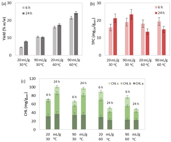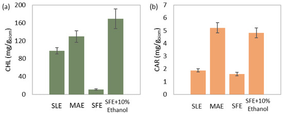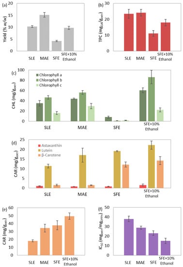 Moreover, the order of increasing chlorophyll content was as follows: SFE, SLE, MAE, and SFE+10% ethanol (Figure 5c). A polar solvent choice is considered suitable for the extraction of chlorophylls [61], even when added during SFE in typically low concentrations [62]. Therefore, all methods presented higher chlorophyll content than SFE, which utilizes the non-polar CO2.