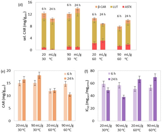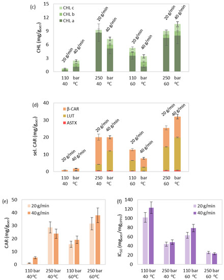 In terms of the selected and total carotenoid content, the increasing order was as follows: SLE, MAE, SFE, and SFE+10% ethanol (Figure 5d,e). The combination of the non-polar CO2 and the polar ethanol (SFE+10% ethanol) improved the extraction of the corresponding non-polar hydrocarbons (e.g., β-carotene) and the more polar xanthophylls (e.g., astaxanthin, lutein) [63]. It is also observed that β-carotene recovery was justifiably not favored during SLE and MAE, but remarkably improved during SFE and SFE+10% ethanol.