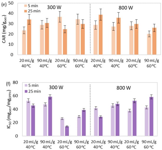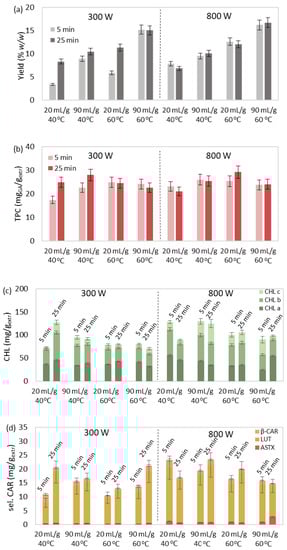 The effect of temperature, time, solvent-to-biomass ratio, and microwave power on MAE’s (a) yield, and extract’s (b) total phenolic, (c) chlorophyll, (d) selected, and (e) total carotenoid content, and (f) index of antioxidant activity.