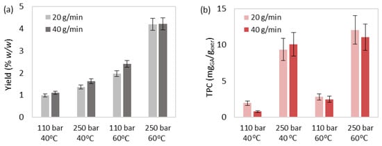 The total phenolic content increase order was similar to yield (Figure 5b). TPC of the examined S. obliquus biomass probably consisted of more flavonoid glycosides and phenols of high molecular weight, which are effectively recovered by polar solvents (e.g., ethanol, water), rather than flavonoid aglycons, phenolic acids, and some phenolic terpenes, which are effectively extracted by non-polar solvents (e.g., CO2) [56].