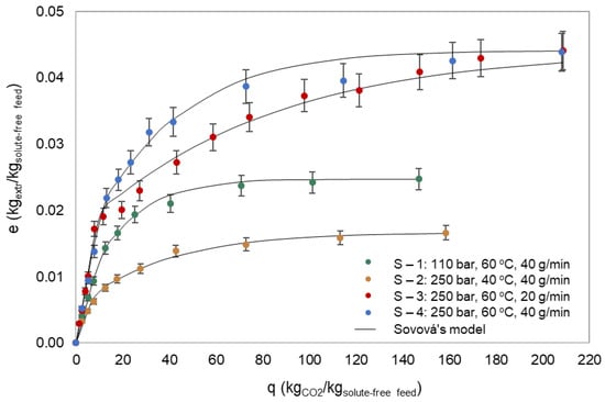 Correlation results of experimental SFE yield data with Sovová’s model versus the specific amount of solvent (kgCO2/ kgbiom). The error bars stand for the experimental error.