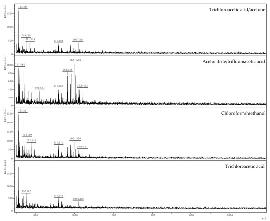 MALDI-TOF MS spectra of the BC patient’s sample prepared by different precipitation methods using reflector mode, m/z 600–2000.