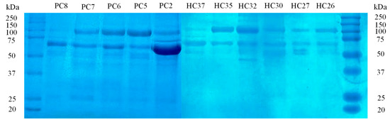 Representative results of 1D SDS-PAGE analysis from HCs (HC37, HC35, HC32, HC30, HC27, HC26) and BC patients (PC8, PC7, PC5, PC2).