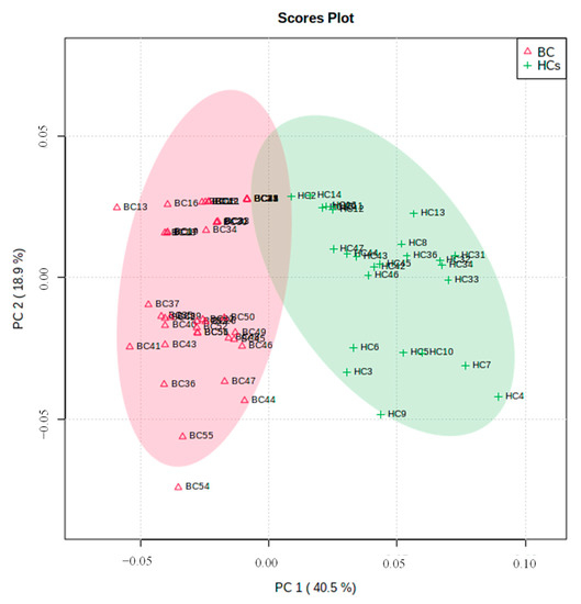 In a univariate statistical analysis, a total of six distinct peaks were identified between the two sets of samples ranked by p-values from the t-test, and four of them were significantly expressed. Of those, four peaks were up-regulated, while two peaks were down-regulated in BC patients compared with the HCs. To attain an enhanced observation between the differences and similarities among the groups, an unsupervised multivariate approach PCA was applied. The first (PC1) and second (PC2) principal components account for 59.4% of the total variability (Figure 6). For both groups, the projection of the sample arises from separate clusters. The group positioned in PC1 positive includes the BC patients, while the group placed in PC1 negative corresponds to the HCs. These results showed that general similarities and differences of the samples under study can be visualized and, therefore, the group of cases can be organized into two different sets based on the clinical condition of the subjects.