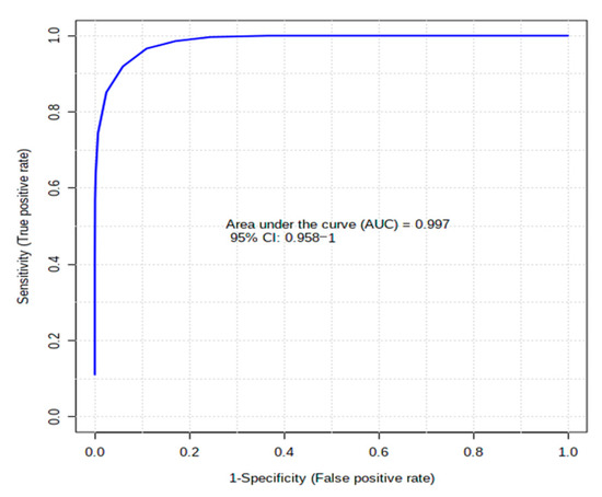 To further assess the predictive value of the peaks to distinguish the groups under study (BC patients and HCs), a ROC analysis was produced using the top four features established by VIP values (Figure 8). This analysis allowed the identification of true positives and false positives, and the predictive ability is determined utilizing the area under the curve (AUC) [42]. Agreeing with Xia et al. [43], an AUC between 0.9 and 1.0 is excellent and between 0.8 and 0.9 is good. So, based on this, the results achieved were very good (AUC = 0.997), with a 95% confidence interval (95% CI) of 0.958–1, representing good accuracy in the discrimination of the two groups. For 95% confidence intervals, the sensitivity, specificity, and positive and negative predictive values for m/z 1046.5, 1062.5, 1237.7 and 1727.9 were 88, 98, 96 and 94%, respectively.