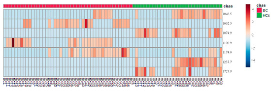 The following supporting information can be downloaded at: https://www.mdpi.com/article/10.3390/separations10050291/s1, Table S1: Characteristics of subjects who participated in the study; Figure S1: Heatmap of m/z values for samples from BC patients and healthy control (HCs).