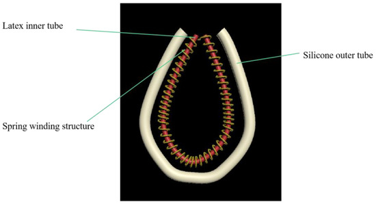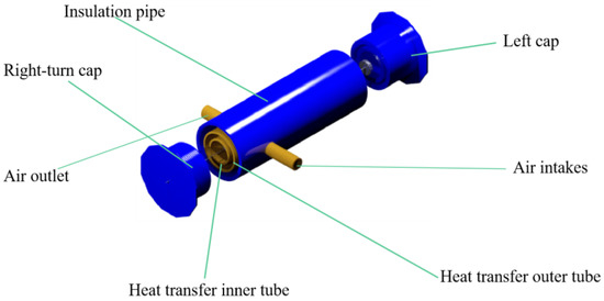 Saeid et al. [39] simulated the jet impingement heat transfer process of a moving plate under steady laminar flow conditions. The study showed that the convective heat transfer of the moving plate was related to thermal conductivity. Based on this, this paper designed a constant-temperature conveying gas pipe, as shown in Figure 3. This is a device that plays a connecting and continuous heating process during the entire gas sample collection, transfer, and laboratory process. The sampled gas needs to be continuously heated and transported through the constant-temperature gas delivery pipeline. The gas transmission pipeline heating device is composed of a sampling tube, spring tube, and silicone tube. The space between the sampling tube and the silicone tube is the hot air channel. During sampling and testing, the sampling tube is continuously heated through the intermediate heating channel so that the gas components do not condense. The intermediate spring tube mainly plays the role of isolation to prevent the latex tube from adhesion to the silicone tube during the heating process. The thickness of the silicone tube is thicker than the sampling tube and the spring tube, and its purpose is to insulate heat.