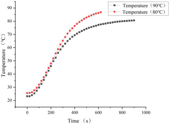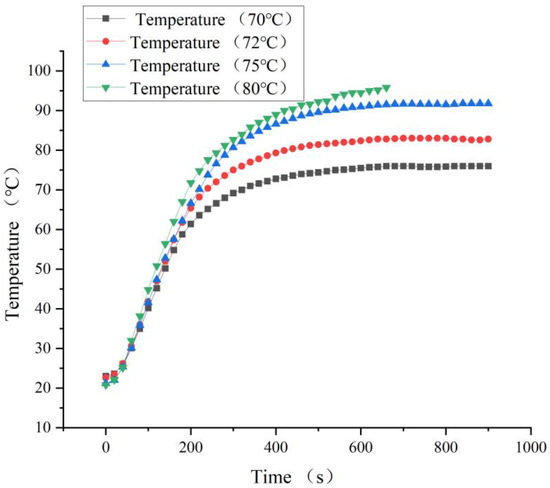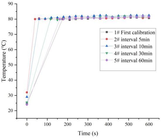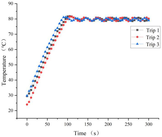 The selected hot air system power was 3300 W, the working voltage was 220 V, and the minimum air volume was 400 L/min. The time required for the hot air system to reach 80 °C and the temperature control accuracy were tested. The heating system was tested for thermal stability for 10 min using a high-precision thermometer, as shown in Figure 7. The heating system took no more than 3 min to reach 80 °C, and after the temperature reached 80 °C, the thermal stability performance was good, and the temperature control accuracy was ± 3 °C. When the hot air system was tested for the first time, it took 175 s to reach 80 °C, which was a long time. After 5 min of testing, it took 40 s to reach 80 °C, which was greatly shortened, because the parts and heating elements in the heating system were at a high-temperature level. After 10 min, 30 min, and 60 min tests, the time required to reach 80 °C gradually increased. In general, the thermal response performance and temperature control accuracy of the heating system can meet the requirements of this experiment.