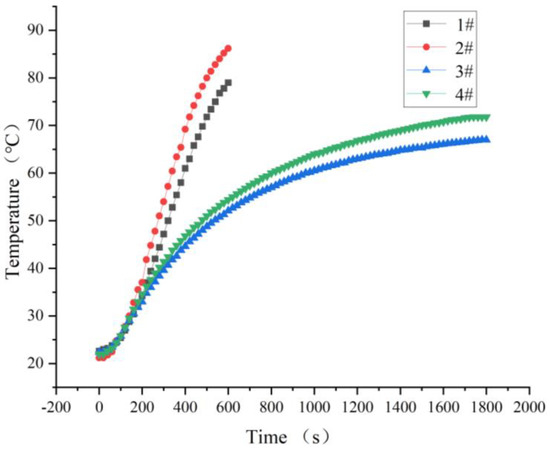 When testing the 100 mL constant-temperature transmitter, 4 different heating conditions were numbered, and the heating conditions inside the No. 521 glass syringe (No. 1 heating belt; 90 °C), the inner wall of the No. 521 glass syringe (No. 1 heating belt; 90 °C), the inside of the No. 514 glass syringe (No. 2 heating belt; 80 °C), and the inner wall of the No. 514 glass syringe (No. 2 heating belt; 80 °C) were numbered 1#, 2#, 3#, and 4#, in turn. The thermal response test data of the 100 mL thermostatic transmitter are shown in Figure 5. It can be seen in Figure 5 that when the temperature of the No. 1 heating belt was set to 90 °C and the temperature of the No. 2 heating belt was set to 80 °C, the inner wall and the inside of the No. 1 heating belt syringe barrel reached 80 °C significantly faster than the No. 2 heating belt. At the time of the test, the ambient temperature was approximately 25 degrees, and the time spent for the inner wall of the No. 1 heating syringe barrel to reach 80 °C was 8 min and 20 s, and the internal time was 10 min and 20 s. The heating time of the inner wall of the No. 2 heating belt was only 71.8 °C when the heating time was 30 min, and the internal temperature was only 67 °C. Based on the influences of the heating belt temperature and heating belt type on the heating speed, the No. 1 heating belt and No. 521 glass syringe were selected, and the heating temperature was set to 90 °C. When used on-site, the heating time of the 100mL thermostatic transmitter was at least 10 min.