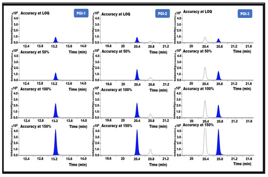 Accuracy is the degree to which a measured value is within a certain range of true or standard values. Recovery analysis of a matrix API that had been spiked with a PGI standard was used to assess the accuracy. Therefore, PGI-1, PGI-2, and PGI-3 were added to the posaconazole at the following concentrations: LOQ (0.025 ppm), 50% (0.05 ppm), 100% (0.1 ppm), and 150% (0.15 ppm). Posaconazole samples without impurities were prepared in triplicate for the accuracy experiment, then injected into the GC-MS/MS.