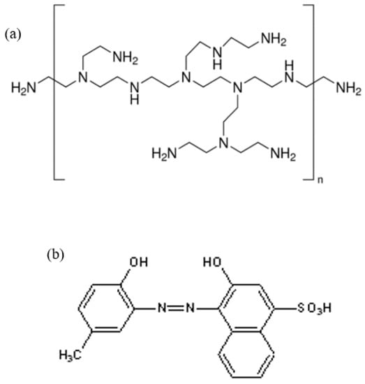 Polyethyleneimine (Average Mw ~750,000, average Mn ~60,000, 50 wt.% in H2O) was purchased from Sigma Aldrich and used for Zilla spinosa modification. All chemicals used in this study, including HCl, NaOH, etc., are of pure grade and are handled without any additional purification. Calmagite, with a molecular weight of 358.4 g/mol and chemical formula C17H14N2O5S, was supplied from Sigma-Aldrich in salt form and used as an adsorbate model. Deionized water was used to prepare aqueous solutions. Figure 1 gives the chemical structures of polyethyleneimine polymer and calmagite dye.