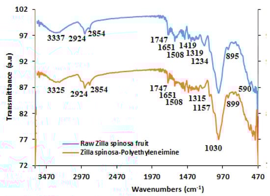 Figure 3 gives the FT-IR spectra of raw Zilla spinosa and Zilla spinosa-polyethyleneimine. The absorption peaks observed for the FT-IR spectrum of virgin Zilla spinosa prove the cellulosic structure of the studied biomass. Indeed, the absorption peak at 3337 cm−1 is assigned to the hydroxyl stretching groups. The absorption peaks seen at 2924 cm−1 and 2854 cm−1 confirm the existence of C–H stretching of –CH3 and –CH2 groups, respectively [19,20]. The peak at 1747 cm−1 corresponds to the C=O group of hemicelluloses [19,20]. The absorption peak at 1508 cm−1 could be attributed to the stretching vibrations of C=C aromatic groups in lignin [21,22]. The peak observed at 1319 cm−1 corresponds to the angular deformation of –CH groups in hemicelluloses [22]. The peak at 1030 cm−1 could be assigned to either C–O symmetric or asymmetric stretching vibration (–C–O–C– ring) of cellulose. The peak at 899 cm−1 is assigned to the out-of-plane angular deformation of –CH groups in the substituted aromatic rings [23]. Globally, the FT-IR absorption peaks indicate that Zilla spinosa contains massive oxygenous groups on its surface. Regarding the FT-IR spectrum of Zilla spinosa-polyethyleneimine, no significant changes are observed. However, the position of the hydroxyl groups shifted from 3337 cm−1 to 3325 cm−1, which suggests that the hydroxyl groups of cellulose interacted with the amino groups of polyethyleneimine through hydrogen bonding or electrostatic interactions.