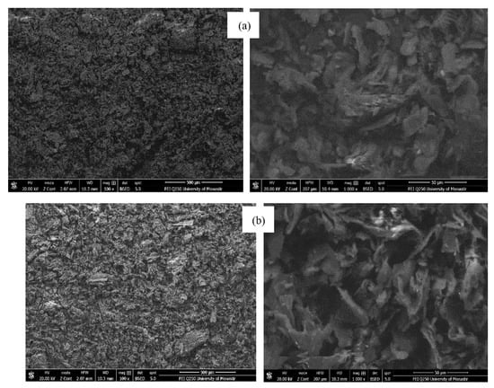 The SEM images of raw Zilla spinosa and Zilla spinosa-polyethyleneimine are shown in Figure 4 and observed at different magnifications (×100 and ×1000). As seen from these images, the particles exhibit irregular shapes, and no significant difference in surface roughness is observed for the unmodified and modified samples. However, the Zilla spinosa-polyethyleneimine sample appears clearer compared with the raw sample. The remarkable difference in color may indicate that the Zilla spinosa surface is homogenously functionalized with the polymer of polyethyleneimine.
