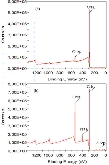 XPS survey of: (a) raw Zilla spinosa and (b) Zilla spinosa-polyethyleneimine.