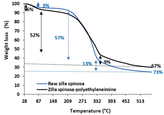 TGA curve of raw Zilla spinosa and Zilla spinosa-polyethyleneimine.